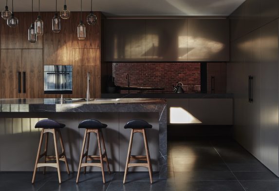 "Every time we met with the clients it was in the kitchen and they would cook while we were talking [about the new design] and we could see how their life was," explains architect Nelson Riofrío. "They're very social, there are always people at their house, their neighbours are always visiting, they are very open in that way." The architects' solution was to imagine two typical gun-barrel extensions to the Victorian frontages but raise one and twist it ninety degrees to create a first floor addition at the back of the property that runs north-south rather than east-west and overhangs the garden to form a shaded courtyard. To maintain the conceptual foundation of the design – and cooking at the heart of the clients' lives – this twist has its central axis in the kitchen space. "It gave it a strong architecture but it also solved the solar requirements as well, and good orientation for the living room and bedroom," says Riofrío's colleague, Tom Carroll. "It gives it quite a bold look and we think a timeless look, too, through its simple forms." To meet the clients' further desire for a neat space that had an aesthetic relationship with the indoor and outdoor entertaining areas that peel off the kitchen, the architects used a minimal material palette, clever cabinetry and the clean lines of the V-ZUG range of appliances. "V-ZUG has an understated simplicity that matched the overarching design. They're neat and functional – and of a quality to withstand heavy use," says Carroll. The Kellys were familiar with V-ZUG through friends who had introduced them to the brand's unique cooking capabilities over a memorable meal. "So when we were getting more serious about our renovation we looked into V-ZUG," says Michael. "The functionality, the efficiency, the whole philosophy behind the brand and what they have delivered. And they've got a pared back, subtle elegance about them [that] really fit in with the aesthetic we were trying to create." The Kellys have been more than delighted with their choice, adding a raft of new cooking techniques and tastes to their repertoire. "Having a steam oven was a whole new experience," says Angela. "It's that professional chef secret, the steam oven, because it's used all the time in commercial kitchens, so you're getting the edge that you don't get in a standard oven. Because it cooks with steam nothing dries out but it's brown and its moist, it works on everything – you can even cook toast in it! It keeps the quality and the integrity of the food without desiccating it." However, their choice wasn't just about good looks and cooking. Sustainability was at the core of their renovation and in addition to hand cleaning the bricks from the demolished walls of the buildings' earlier additions, they re-used or re-homed a significant amount of material. Hardwood timber framing went to a furniture manufacturer, the flooring to Ballarat, the stained glass vestibule doors were recycled and all those bricks found new life in the box-on-a-box extension.