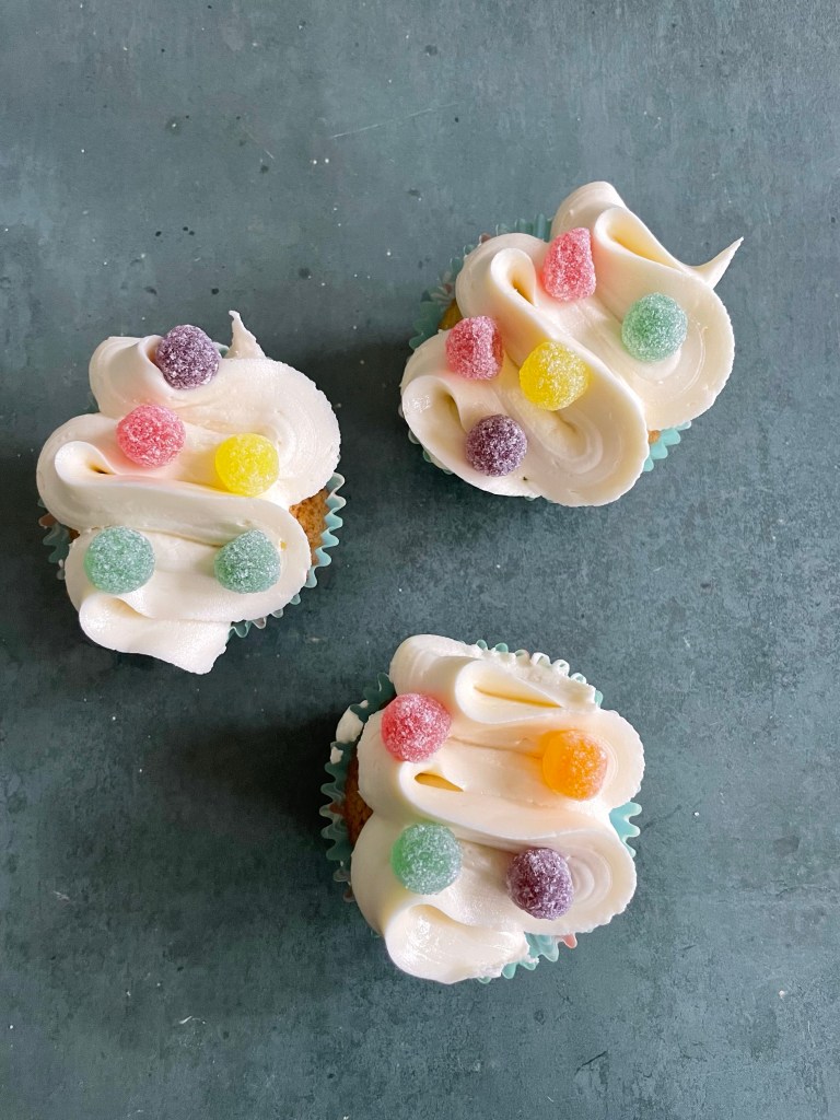 Pipe or spread onto the cooled cupcakes and decorate with sprinkles or sweets.