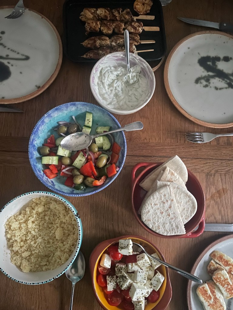 This tzatziki is so good that we have it nearly weekly - served with pittas (homemade if i have time, or from Sainsburys or Waitrose - neither the Tesco or M&S varieties are suitable for us anymore as they contain milk and/or traces of sesame). Alongside our 'little S friendly' Greek style salad which is dressed cucumber, red onion, olives and pepper with a liberal sprinkling of oregano. Little S hates tomatoes so they go in a separate bowl with some feta for the dairy eaters who also like tomatoes!! Often i'll make chicken souvlaki skewers for the meat eaters, griddled for a charred flavour and seasoned with oregano, garlic, dried mint, cumin and lemon juice. Or, my favourite of homemade falafel (using Sami Tamimi's recipe in the awesome cookbook Jerusalem) with Tzatziki and warm pittas - yummy.