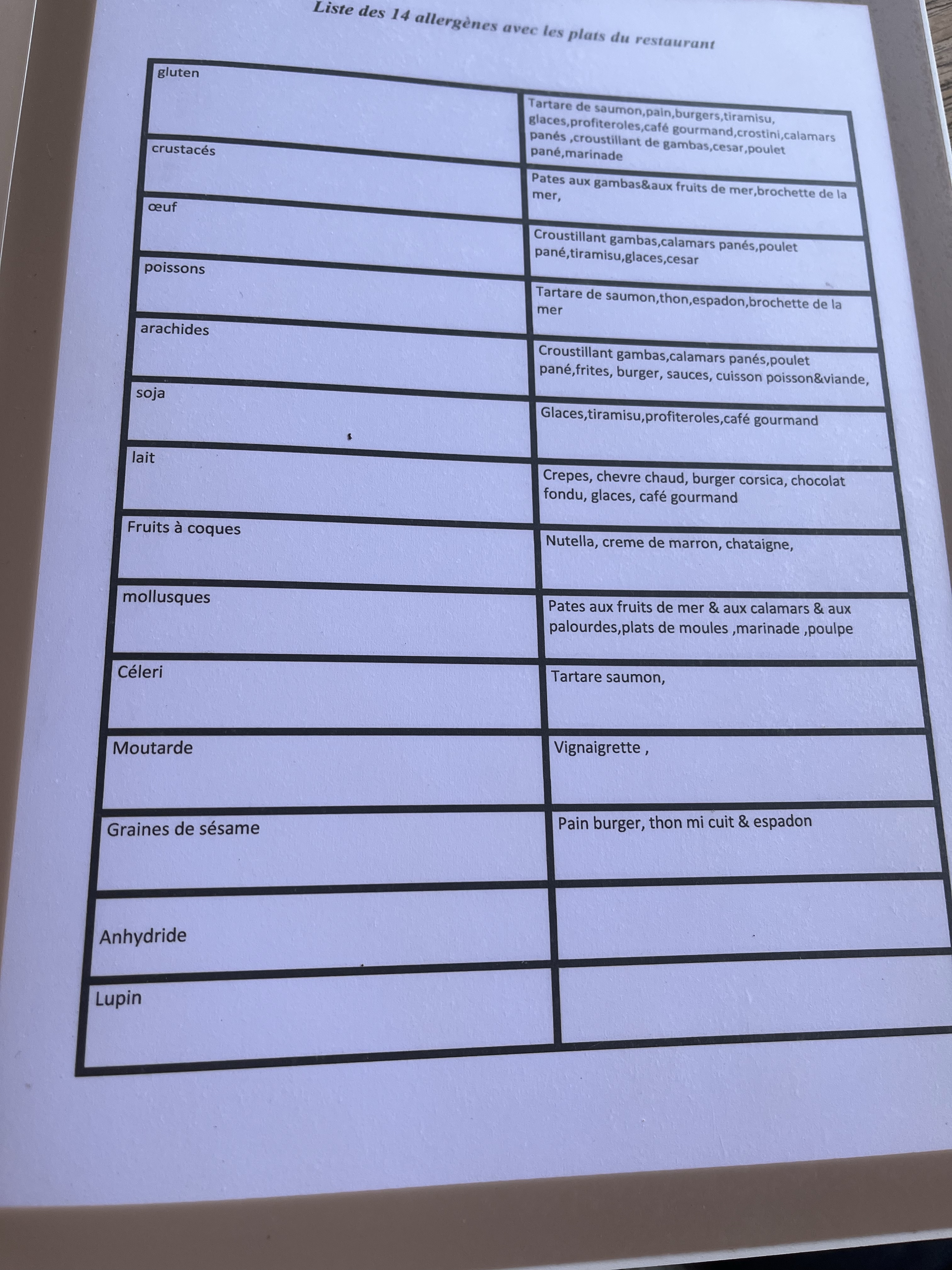 Our most recent trip to Propriano in Corsica is a case in point, we only ate out on the last lunchtime when we knew we needed our packed sandwiches for supper on the plane (never trust airplane food if you have a food allergy). We could have been brave and tried to find somewhere earlier in the trip, but we were just happy eating in our lovely villa and removing some of the inevitable stress. Our meal was in a lovely restaurant right on the beach in Propriano called Le Corsaire.