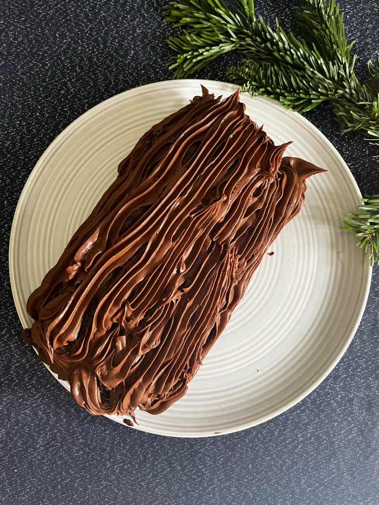 Chocolate Yule log decorated with a whipped chocolate ganache